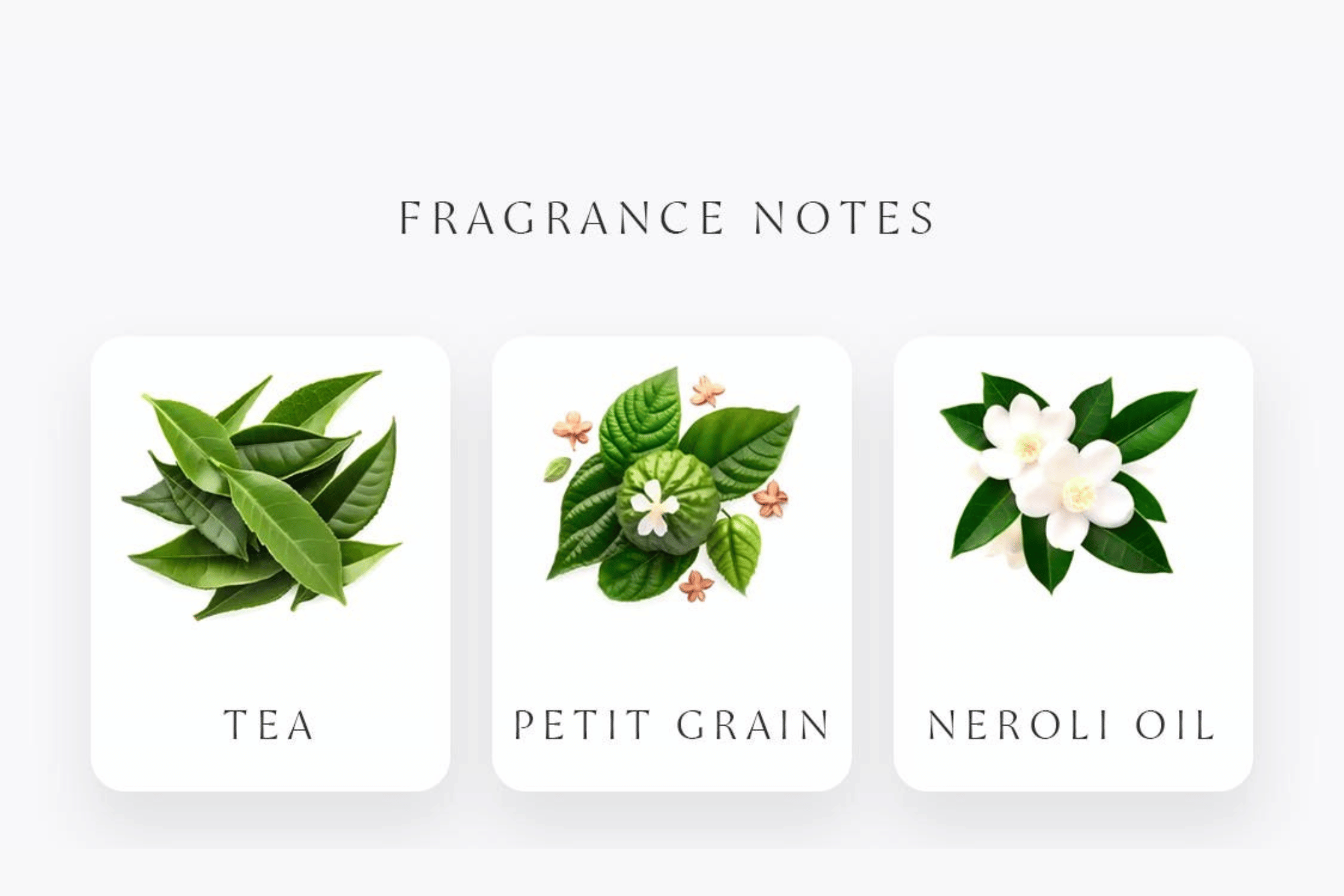 A refreshing clean scent that is light enough for the morning rituals but invigorating enough to give you a burst of energy when you need it. The first whiff instantly tantalizes the senses with an invigorating whirl of tea and petit grain. The fresh citrusy aroma is sweetened by a romantic and delectable heart of neroli oil.